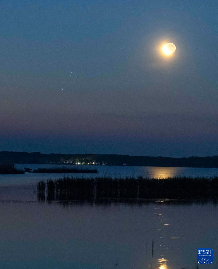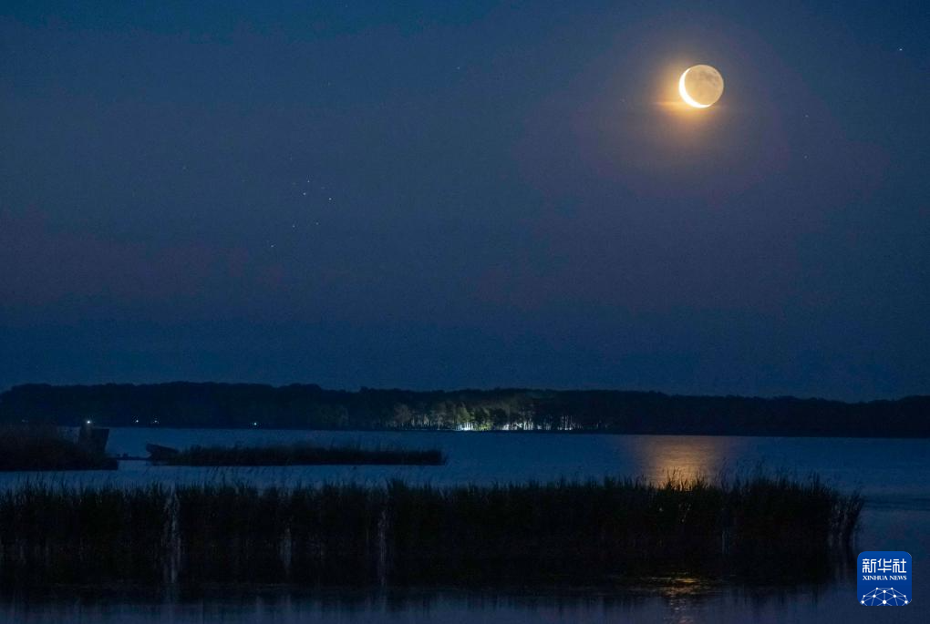 这是6月23日凌晨在黑龙江省齐齐哈尔市克钦湖拍摄的昴星团伴月。