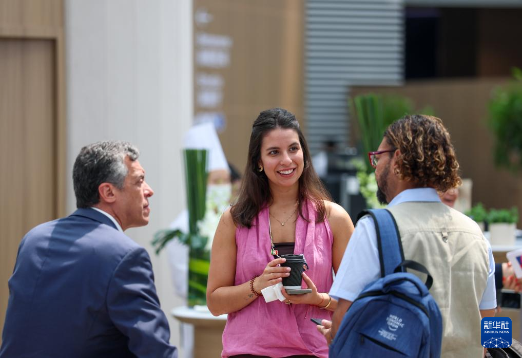 6月24日,在国家会展中心(天津),嘉宾在论坛设置的新领军者村内交流。