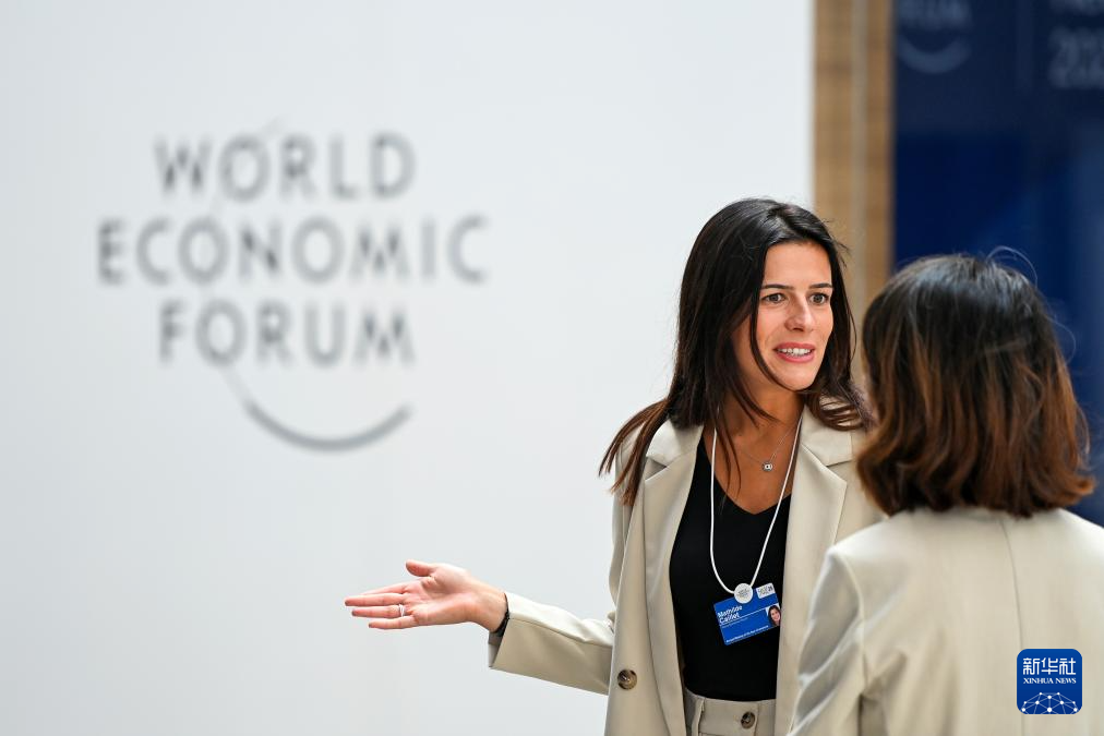 6月24日,两名嘉宾在国家会展中心(天津)论坛会场设置的走廊空间交流。