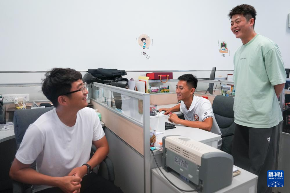 6月22日,卢志勇(中)在学校办公室内和同事交流。