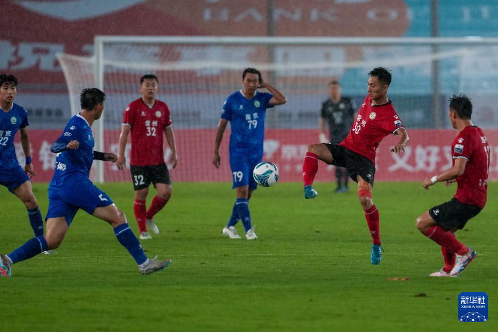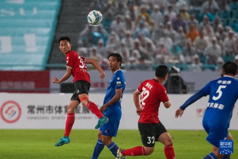 6月21日,常州队球员卢志勇(右二)在“苏超”第五轮对阵南京队的比赛中。最终,常州队主场0比4不敌南京队。