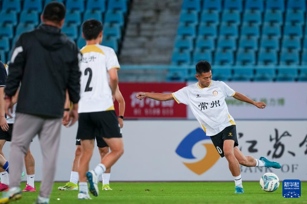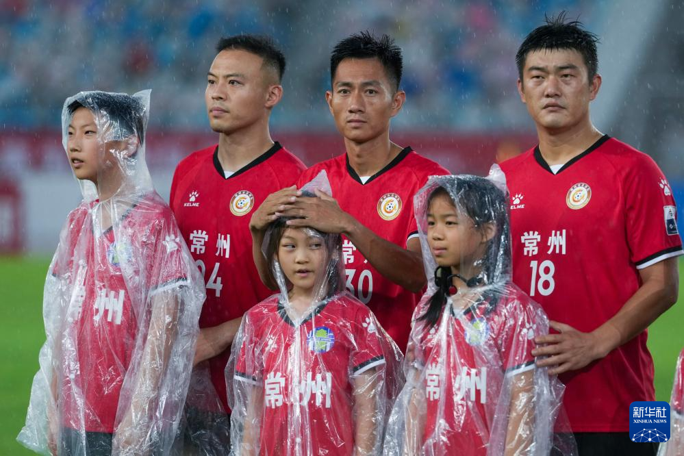 6月21日,常州队球员卢志勇(后排中)在“苏超”第五轮比赛前的出场仪式上。最终,常州队主场0比4不敌南京队。