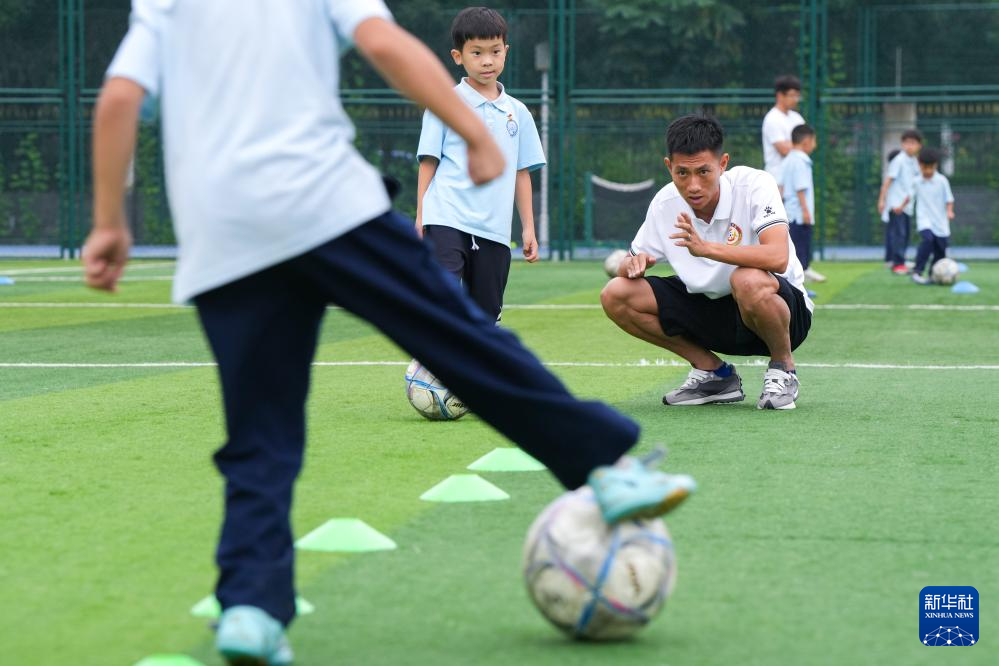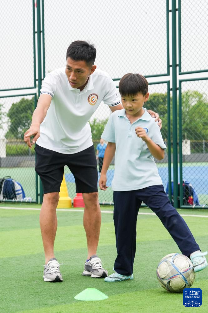 6月22日,卢志勇(左)在训练中指导一名校队小球员。