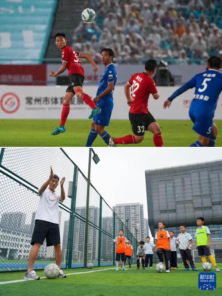 拼版照片:上图为2025年6月21日,常州队球员卢志勇(左一)在“苏超”第五轮对阵南京队的比赛中;下图为2025年6月22日,卢志勇指导校队球员进行训练。