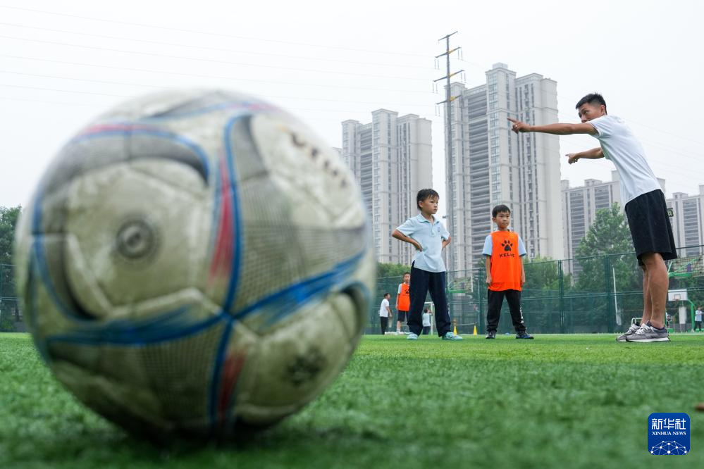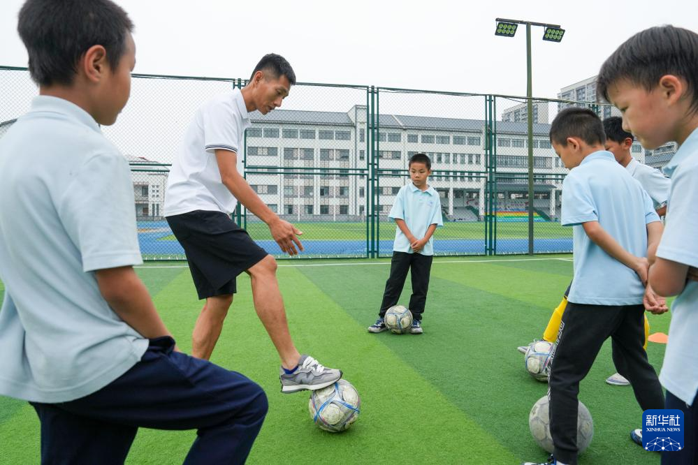6月22日,卢志勇(左二)在学校足球场内指导校队球员进行训练。