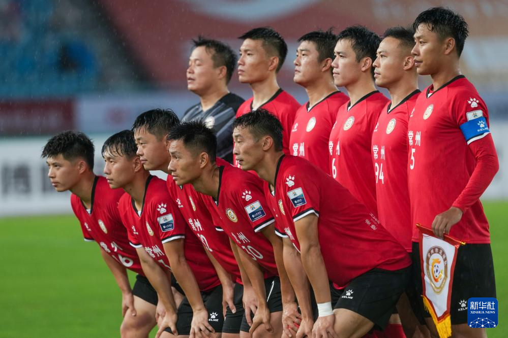 6月21日,常州队球员卢志勇(前排右二)和队友们在“苏超”第五轮对阵南京队的比赛中前合影。最终,常州队主场0比4不敌南京队。