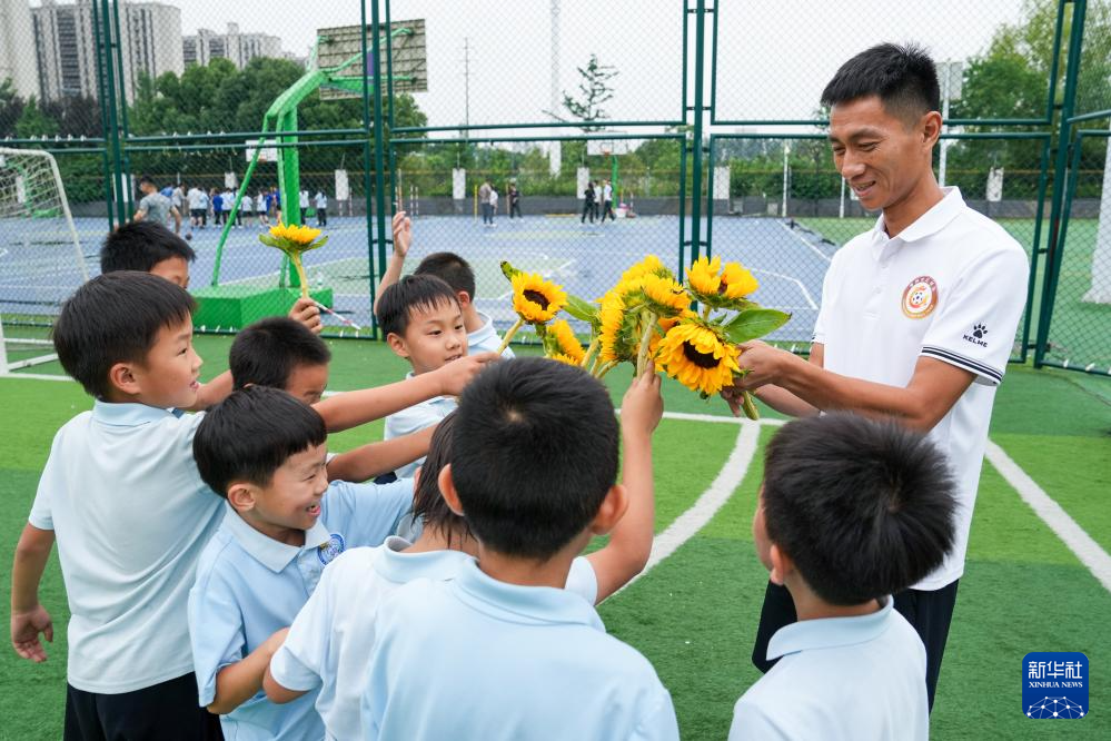 6月22日,校队小球员们在足球训练课前为刚参加完“苏超”第五轮比赛的卢志勇献花。