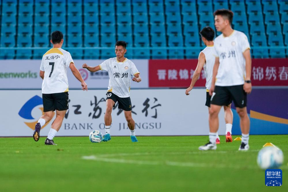 6月21日,常州队球员卢志勇(左一)在“苏超”第五轮对阵南京队的比赛中。最终,常州队主场0比4不敌南京队。