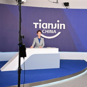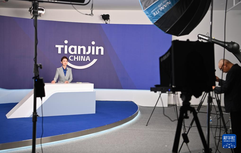 6月24日,在国家会展中心(天津),新闻主播在媒体村准备录制节目。