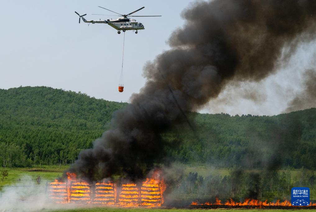 6月24日,在黑龙江省大兴安岭地区的演习现场,一架直升机实施吊桶洒水灭火。