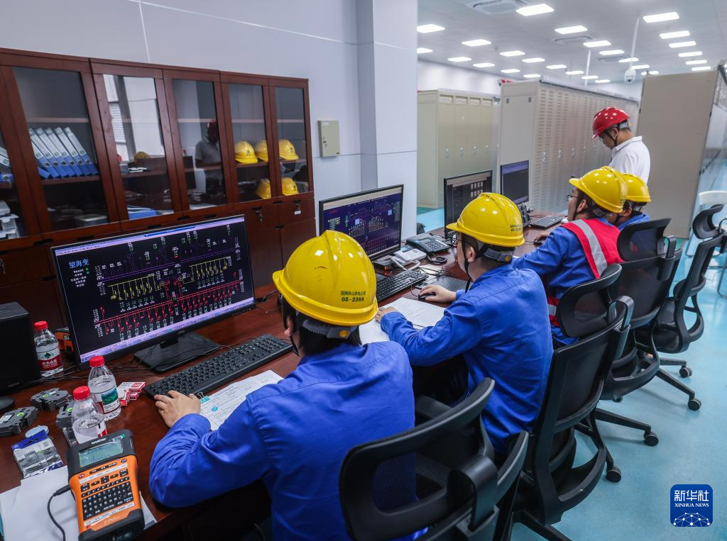 6月24日,工作人员在舟山望海(金塘)220千伏输变电工程变电站主控室内查看设备运行情况。