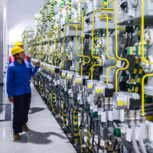 6月24日,在舟山望海(金塘)220千伏输变电工程的变电站GIS室内,工作人员进行投运前的巡检。