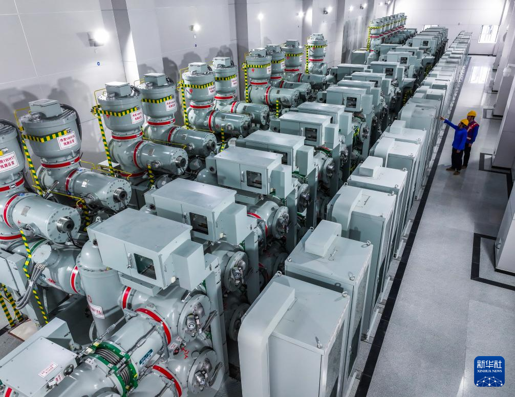 6月24日,在舟山望海(金塘)220千伏输变电工程的变电站GIS室内,工作人员进行投运前的巡检(无人机照片)。