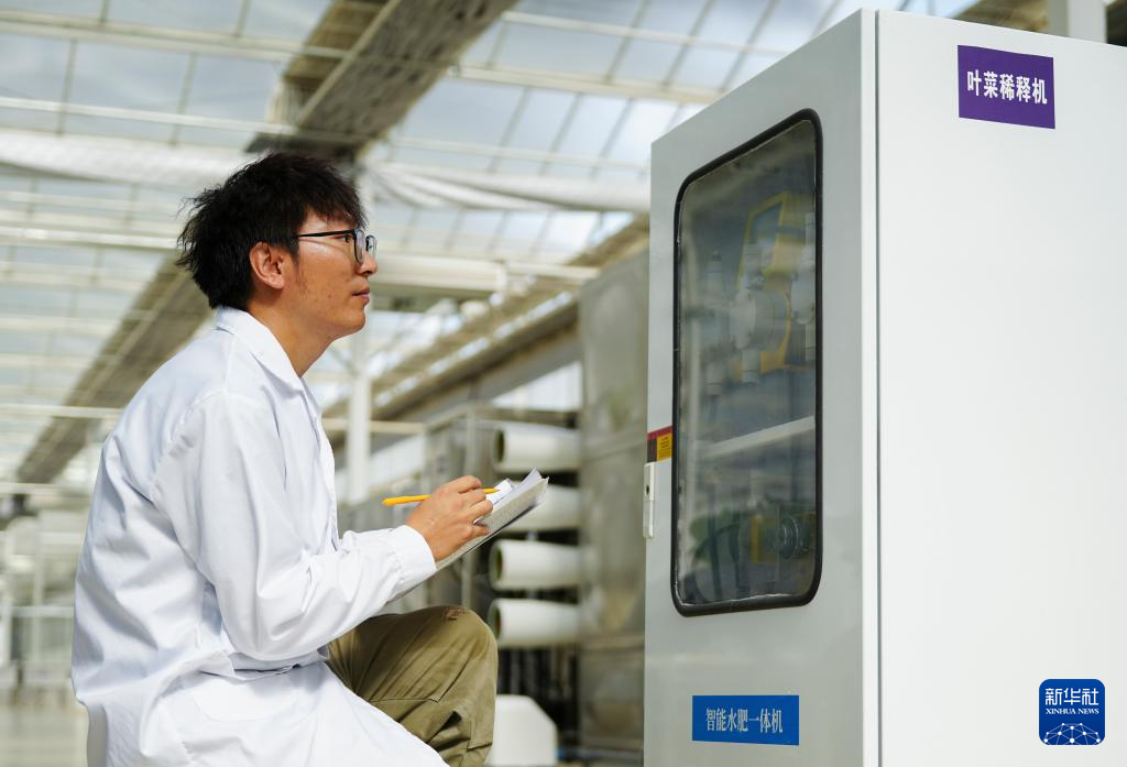 6月25日,在新疆阿克苏地区库车市甬库同心村智慧农业植物工厂,工作人员在监测记录智能水肥一体机运行情况。