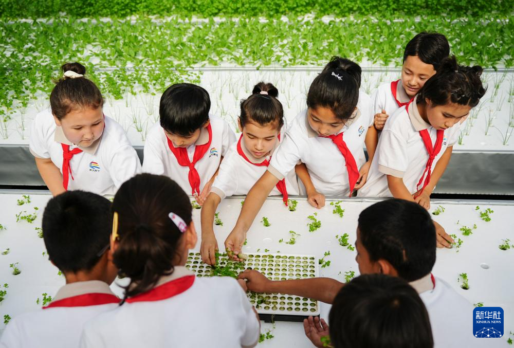 6月25日,在新疆阿克苏地区库车市甬库同心村智慧农业植物工厂,当地小学生体验无土栽培。