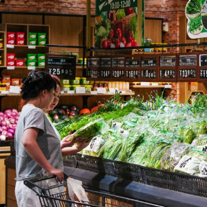 6月25日,在新疆阿克苏地区库车市美连美超市,人们在选购甬库同心村智慧农业植物工厂的农产品。