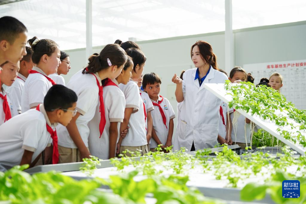 6月25日,在新疆阿克苏地区库车市甬库同心村智慧农业植物工厂,工作人员为当地小学生讲解无土栽培技术。