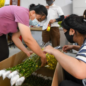 6月25日,工人在海南省白沙黎族自治县打安镇合水村兰花种植基地整理兰花。