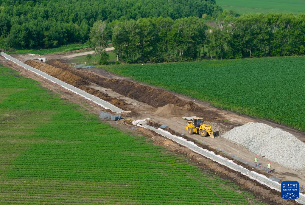 6月23日,北大荒集团北安分公司二龙山农场有限公司对排水沟进行护砌施工,构建柔性防护结构稳定边坡,减少水土流失,保护黑土地(无人机照片)。