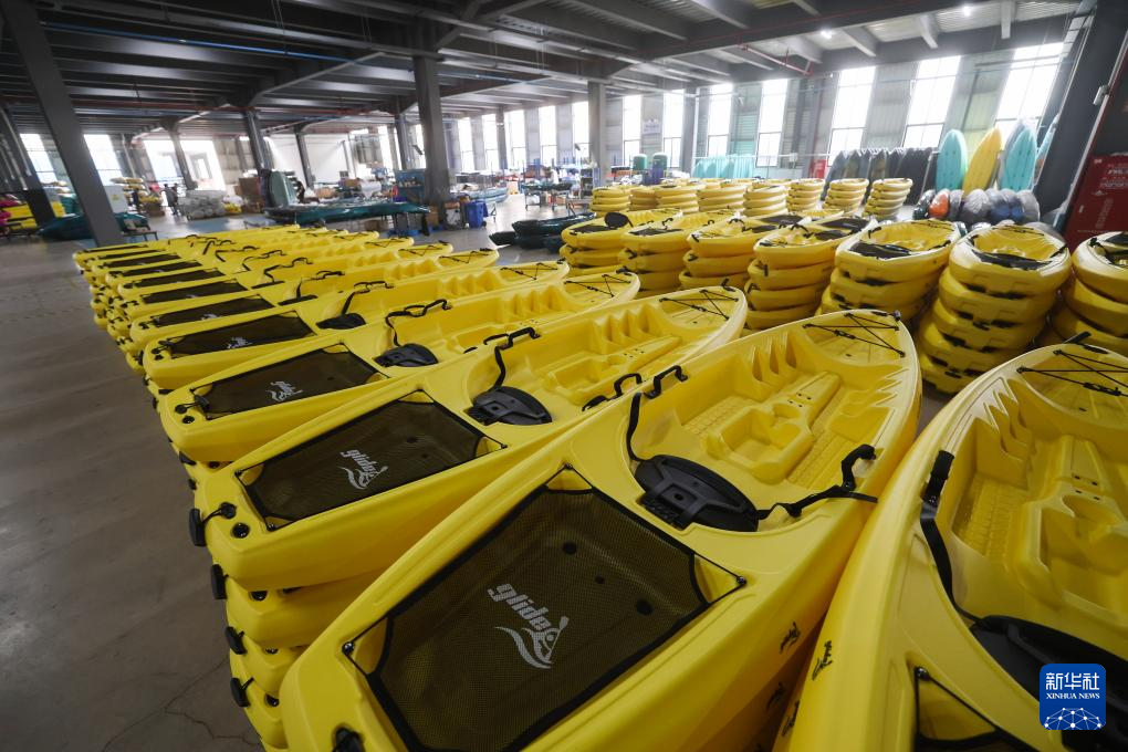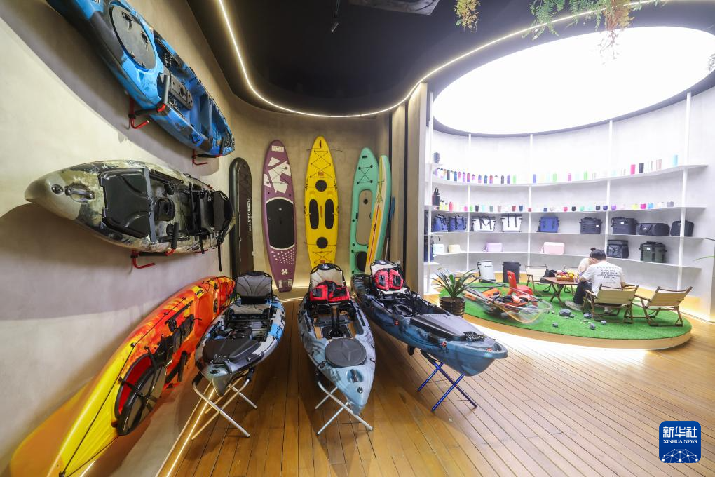 位于慈溪市的浙江酷尔智能科技有限公司的展厅内展示公司生产的各类皮划艇及相关户外用品(6月25日摄)。该公司生产的皮划艇主要出口欧美市场,同时国内需求也在快速扩大。