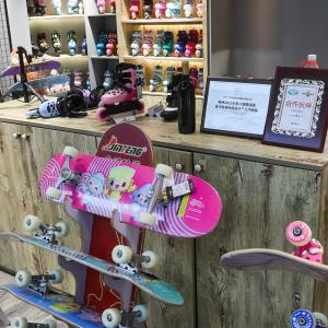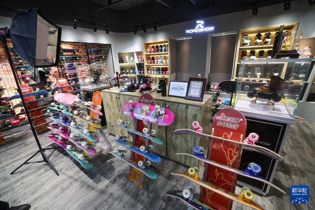 在宁波金峰文体器材有限公司的展示厅内展示的各类滑板和轮滑鞋(6月25日摄)。