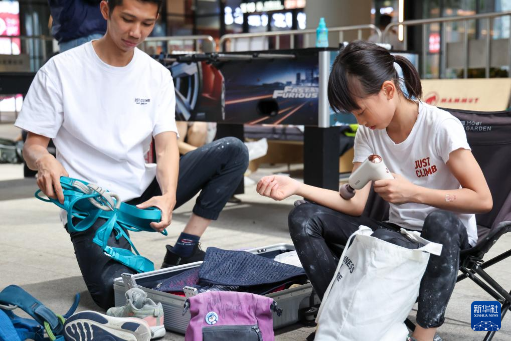 在深圳福田区呢度有家攀岩馆,何芊芊(右)在攀石训练结束后进行放松,爸爸何善挥在准备难度训练的装备(6月17日摄)。
