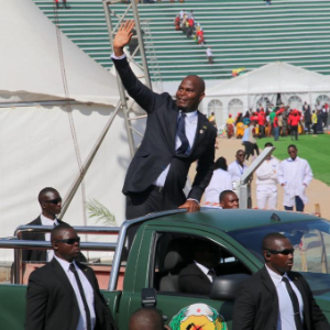 6月25日,莫桑比克总统查波在马普托省马托拉市举行的莫桑比克独立50周年庆典上向观众致意。