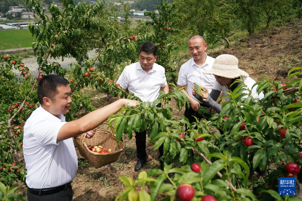 6月24日,在安康市岚皋县孟石岭镇丰景村,岚皋县孟石岭镇前进村第一书记韩超(左一)、岚皋县孟石岭镇丰景村第一书记苏垚(左二)、岚皋县民主镇枣树村第一书记祝振弟(左三)在拍摄创作用于桃子销售的短视频。