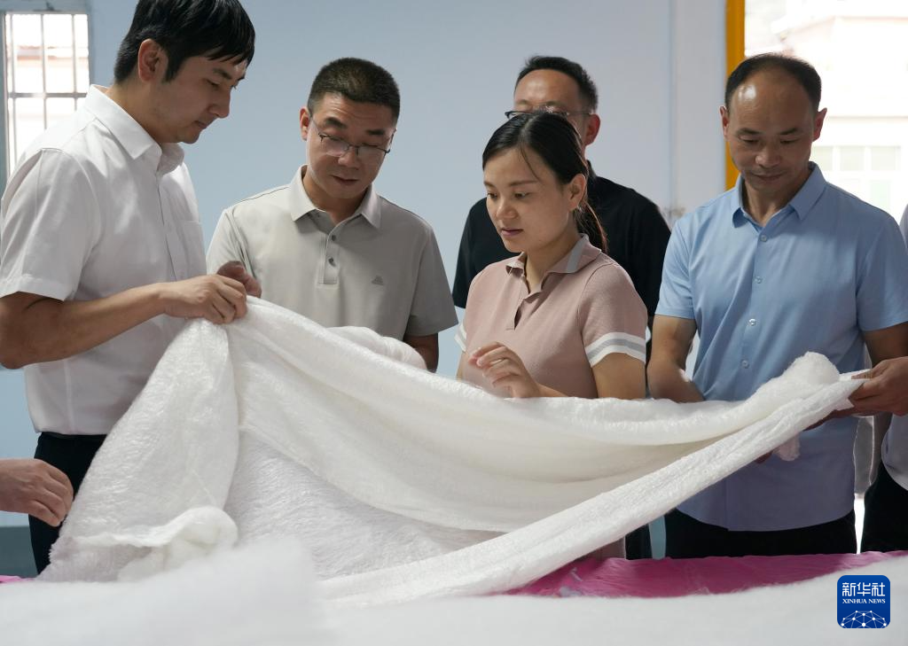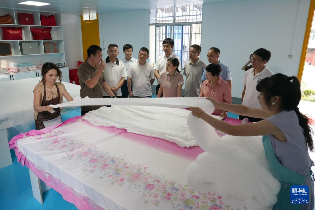 6月23日,安康市汉阴县涧池镇、蒲溪镇等地的多名第一书记,在当地一家蚕丝被生产企业查看用于制作蚕丝被的蚕丝。