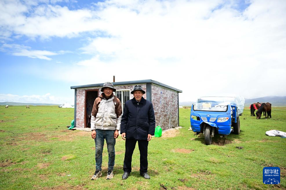 6月26日,万卓(右)与外甥先巴尖措在夏牧场的板房前。随着基础设施改善,牧民们在夏牧场会搭建简易板房居住,相较于帐篷更加暖和。