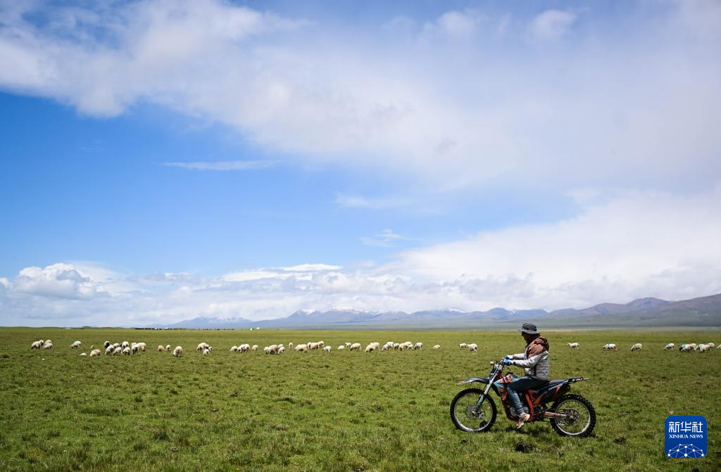 6月26日,先巴尖措在夏牧场骑着摩托放牧。