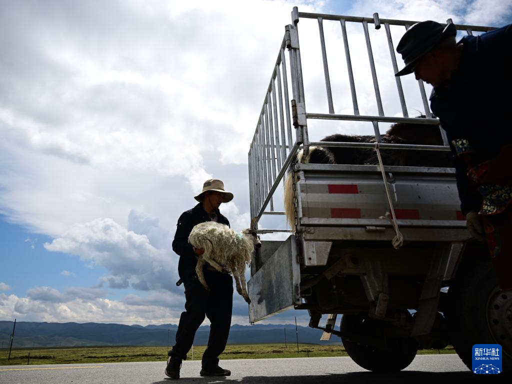 6月25日中午,因为转场途中一只羊羔体力不支,万卓的女婿扎西尖木措(左)开着车来转运。