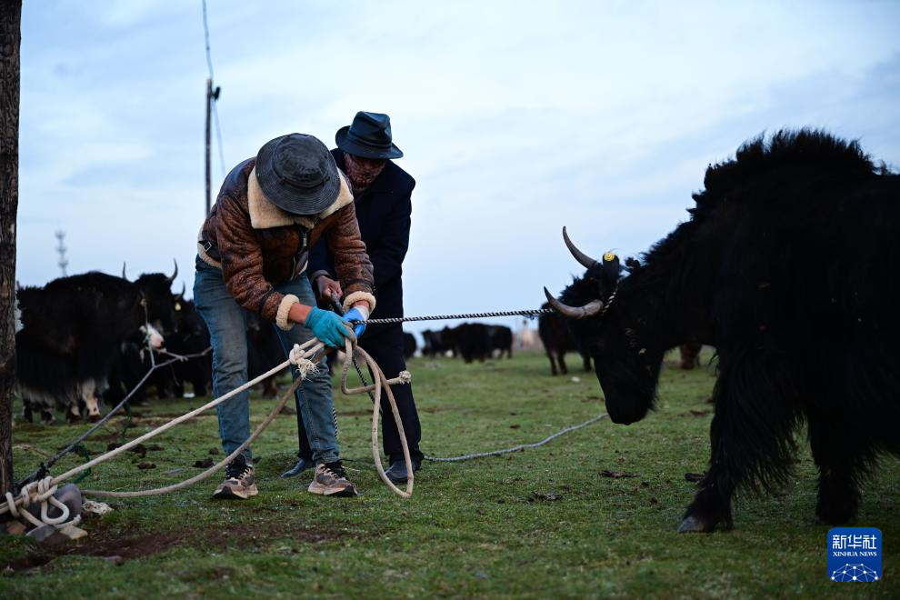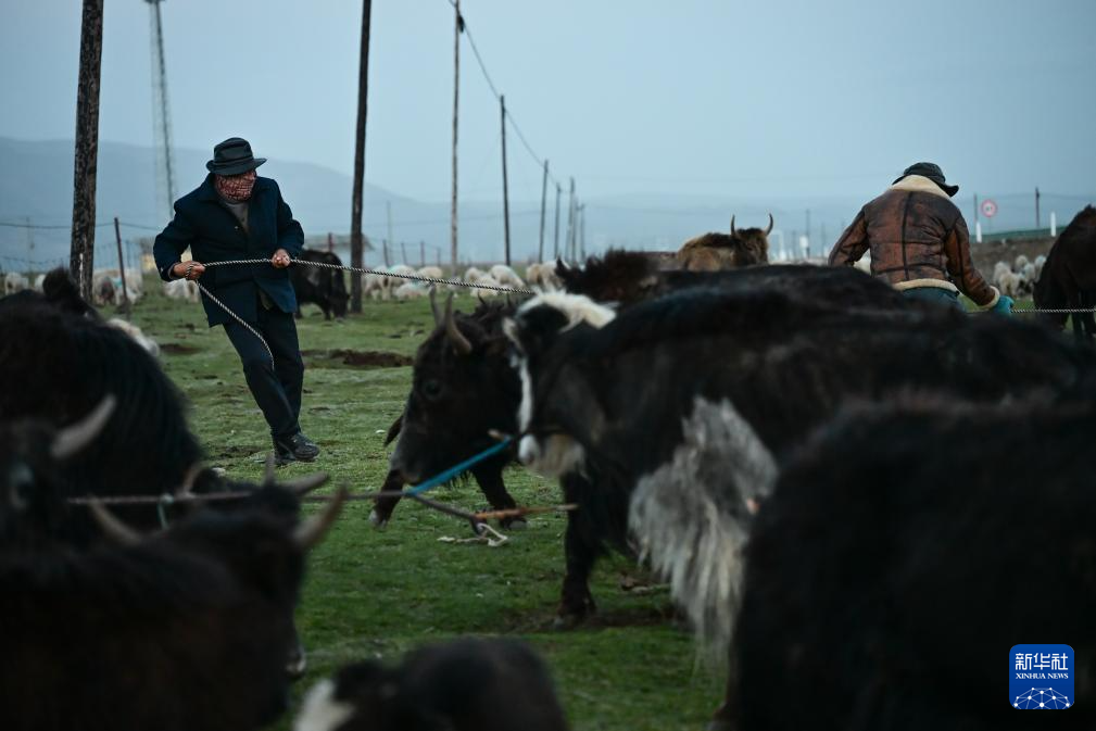 6月25日下午,万卓(左)与先巴尖措在临时休息点上拴牦牛,防止牦牛在夜间混入其他牧民家转场的牛群中。