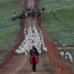 6月25日,默勒镇才什土村的牧民在转场。为了防止羊群混到一起,万卓与外甥先巴尖措在后方骑着马控制羊群。