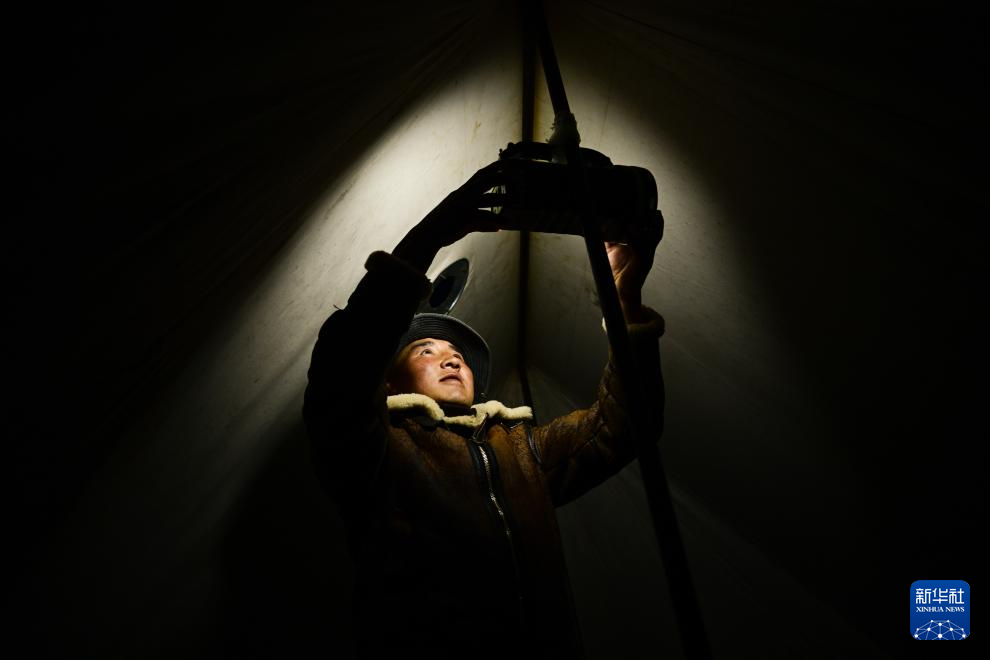6月25日夜间,先巴尖措在帐篷内摆放灯具照明。