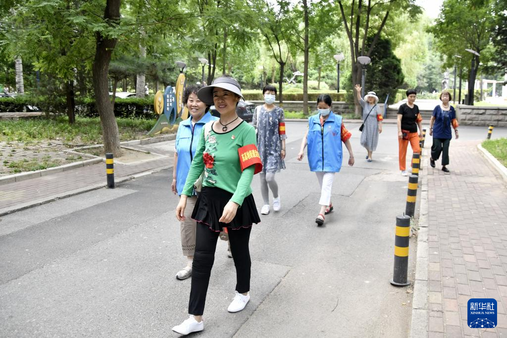6月26日,东高地街道的老党员社区治安巡逻队队员在社区内巡查。