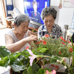 6月26日,东高地街道老党员助老服务志愿队60岁的队员康庆芬(右)和78岁的队员潘秋英(中)来到87岁的独居老人李光俊家陪她聊天解闷。