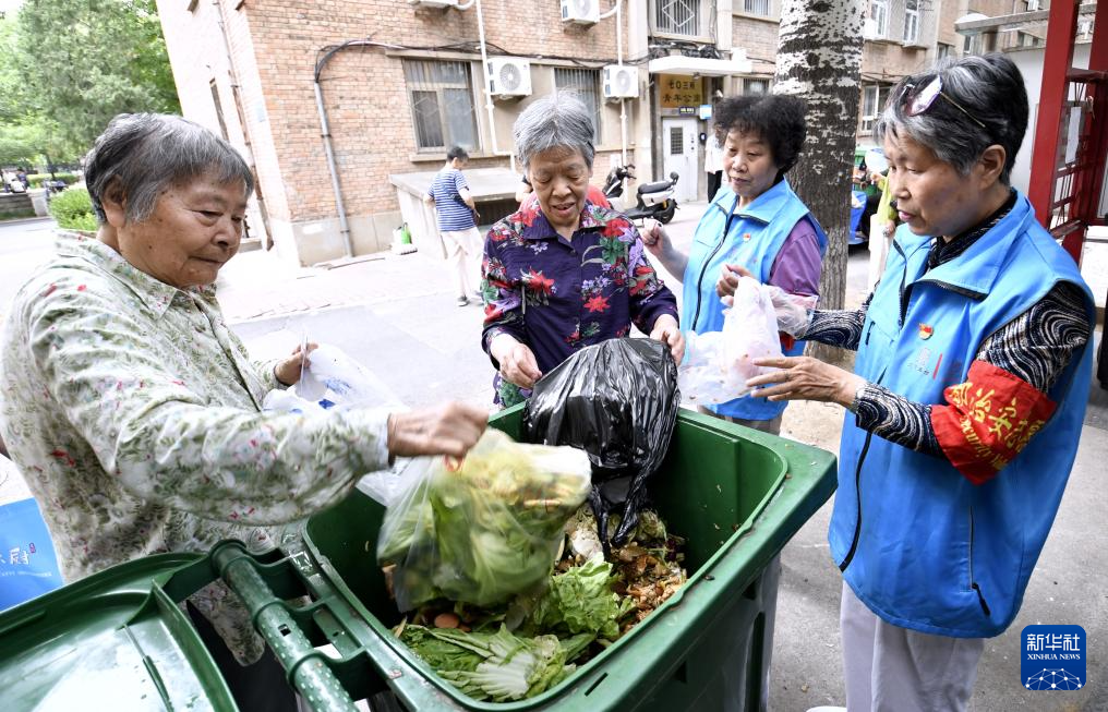 6月26日,东高地街道的老党员垃圾分类指导队队员在社区内指导居民垃圾分类投放。