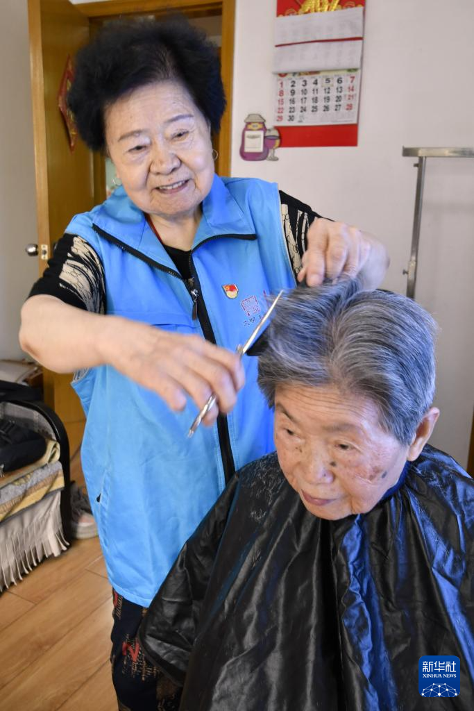 6月26日,东高地街道86岁的党员助老志愿服务队队员张春英(左)在为社区内93岁的老人丁月娣上门理发。