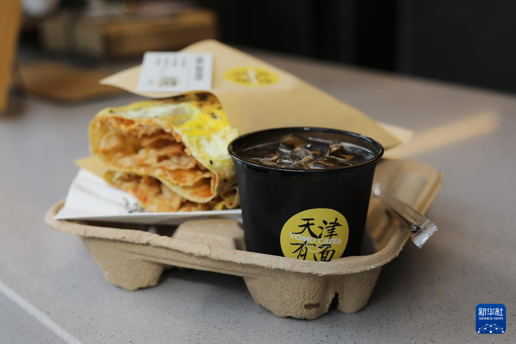 在天津五大道文化旅游区有面儿咖啡店拍摄的新式煎饼馃子配咖啡套餐(6月9日摄)。