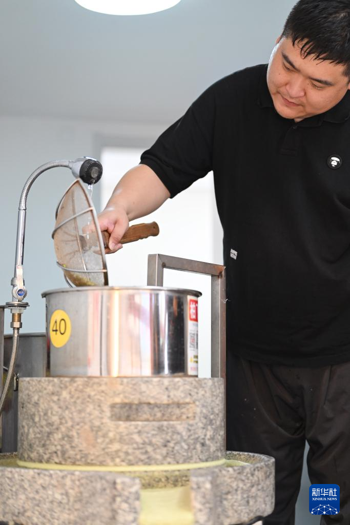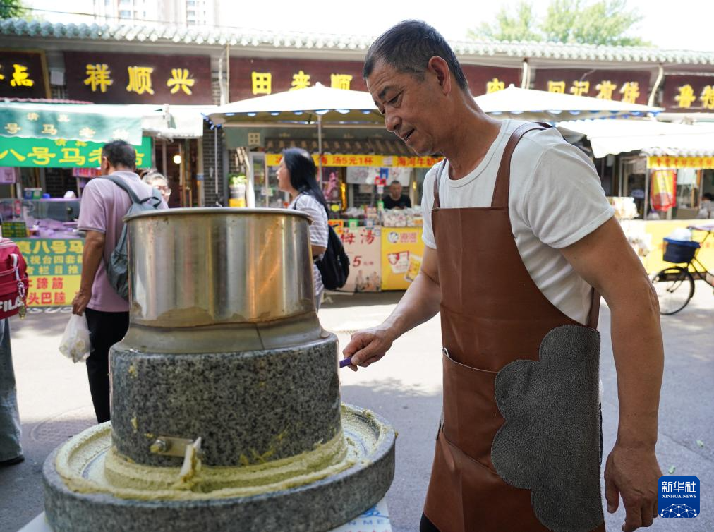 在天津市红桥区西北角特色街区,商户用石磨磨制用于制作煎饼馃子的绿豆面糊(6月11日摄)。