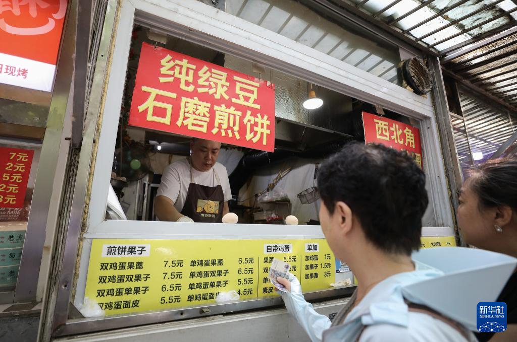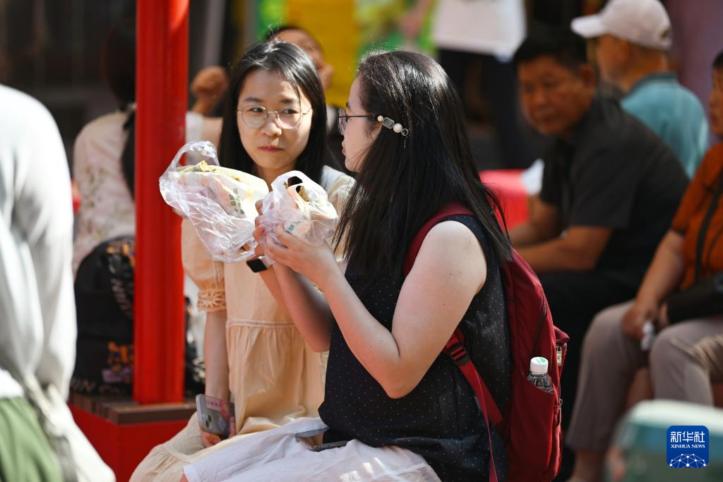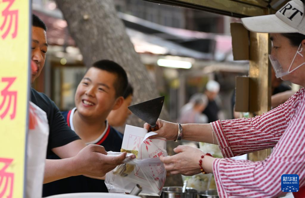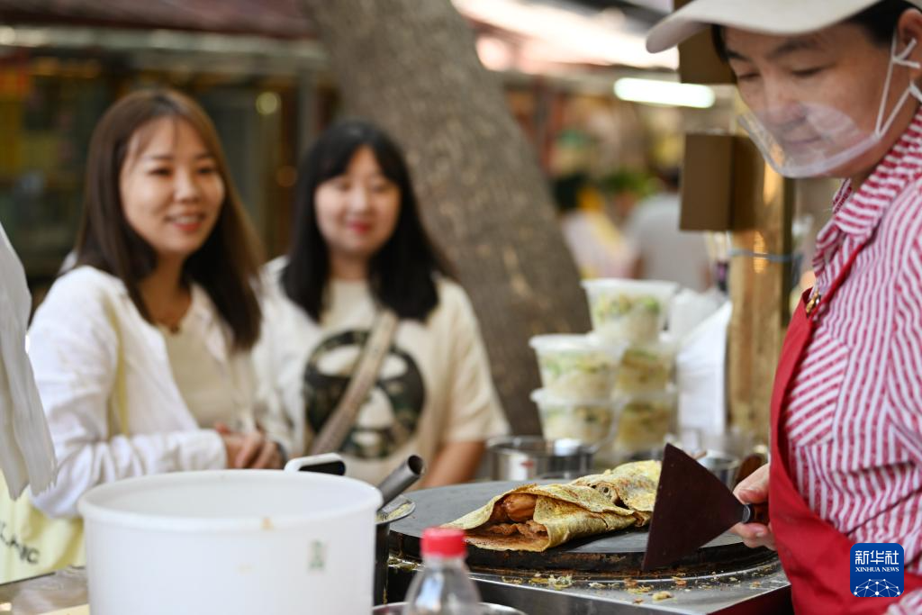 人们在天津市红桥区西北角特色街区吃煎饼馃子(6月10日摄)。
