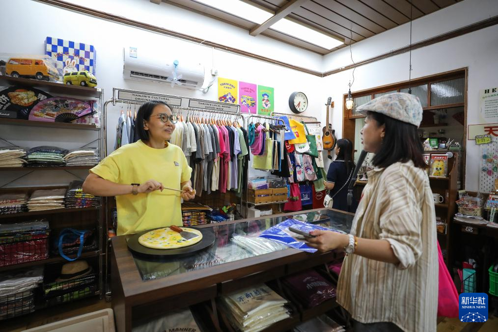 在位于天津五大道文化旅游区的“你好商店”文创店,店长王冉(左)与一名旅居国外的天津顾客聊起煎饼馃子(6月11日摄)。