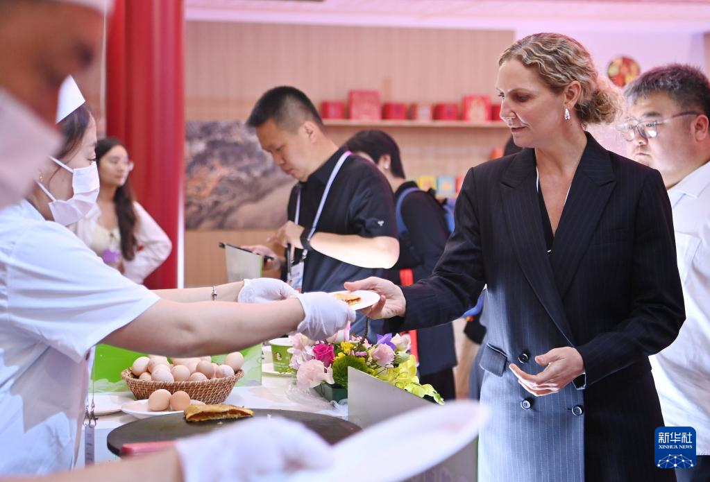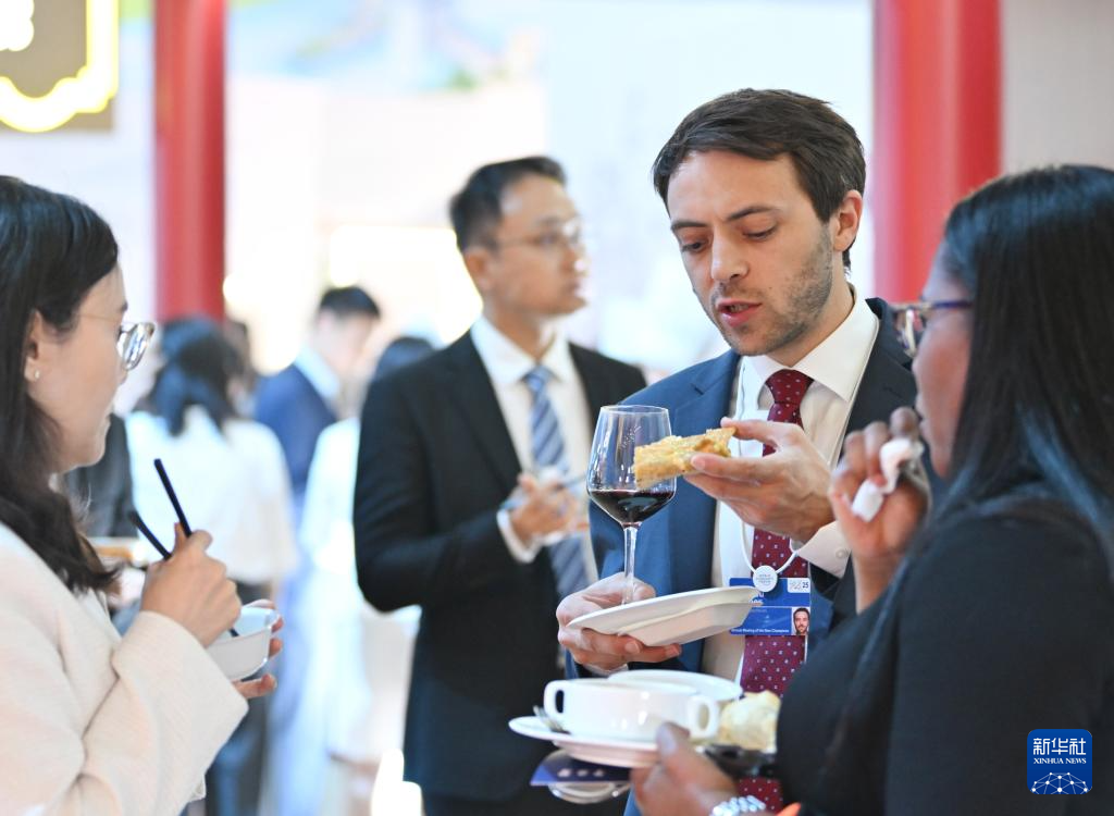 嘉宾在2025年夏季达沃斯论坛文化之夜上品尝煎饼馃子(6月25日摄)。