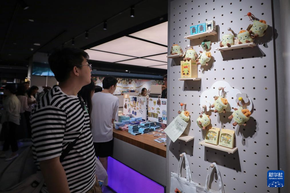 在天津博物馆的文创商店,参观者在煎饼馃子文创产品前驻足(6月10日摄)。
