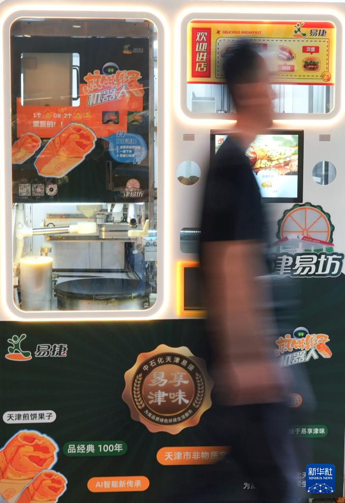 在天津一家便利店内,顾客从一台煎饼馃子机器人前经过(6月11日摄)。