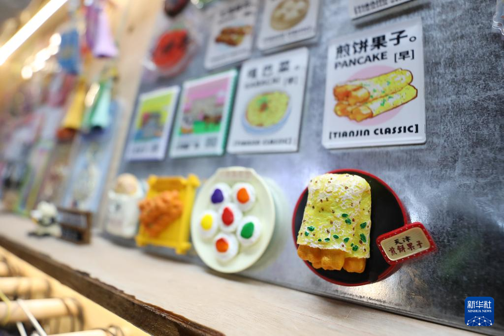 在位于天津五大道文化旅游区的“你好商店”文创店内拍摄的煎饼馃子冰箱贴(6月11日摄)。