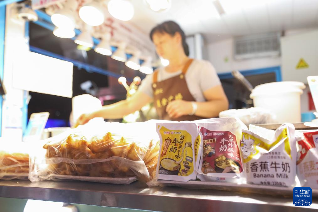 天津一处夜市的煎饼摊位上摆放着煎饼果子味牛奶(6月10日摄)。
