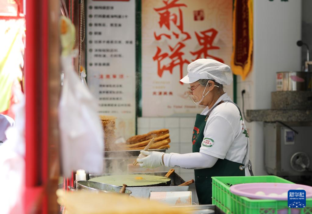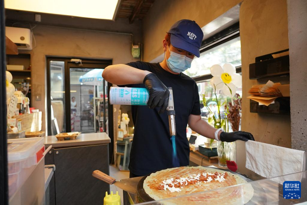 在天津五大道文化旅游区,有面儿咖啡店的工作人员在制作融合西餐风味的新式煎饼馃子(6月11日摄)。