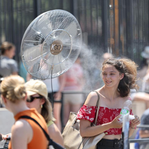 6月27日,在意大利罗马,游客在斗兽场附近一处风扇下纳凉。